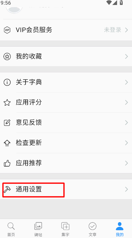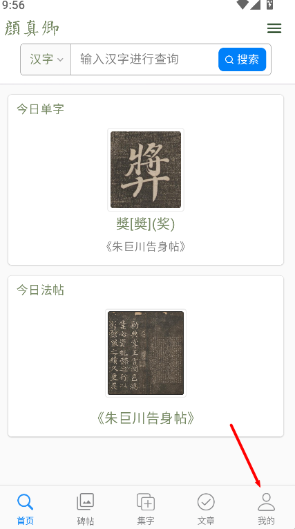 1、打开《颜真卿书法字典》app后,在首页点击页面下方的“我的”选项,进入个人中心界面,可进行账号与偏好设置管理。