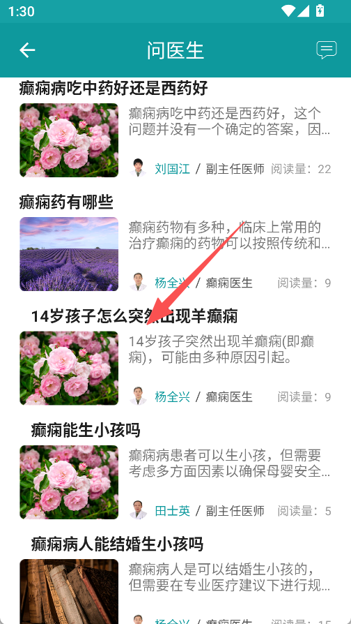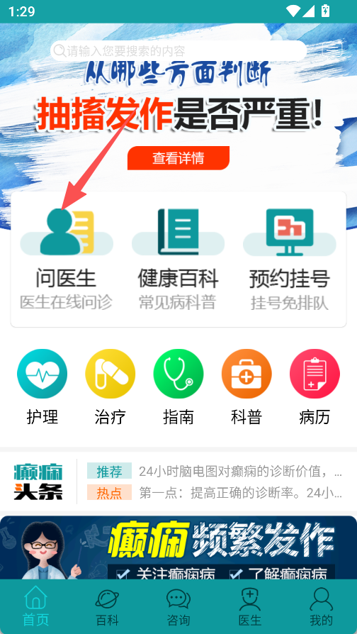 1、点击问医生,选择癫痫问题,进入咨询界面。