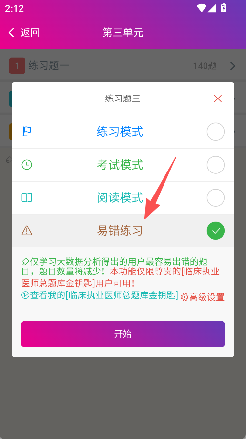 3、在练习模式选择中,点击易错练习,再点击开始做题。