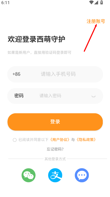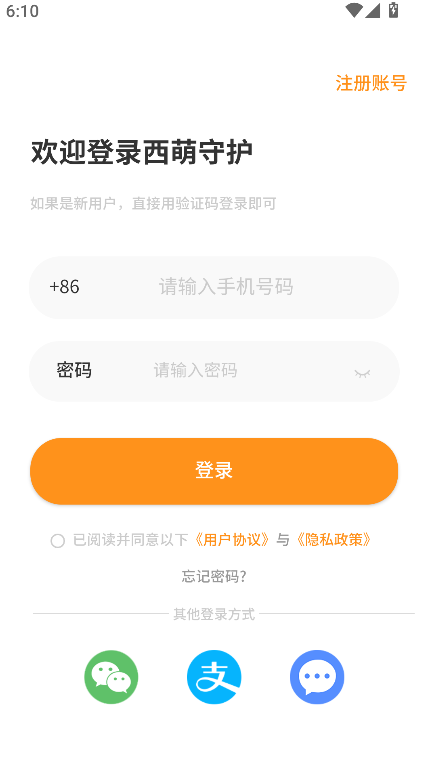 1、打开《西萌守护》软件后,可选择三种登录方式,包括微信、支付宝或手机号登录,方便快捷。