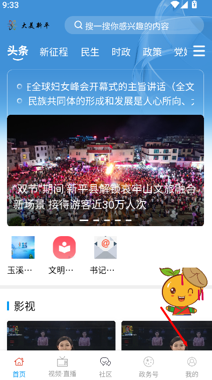 1、打开《大美新平》应用后,进入首页界面,点击右下角的“我的”选项进入个人中心。