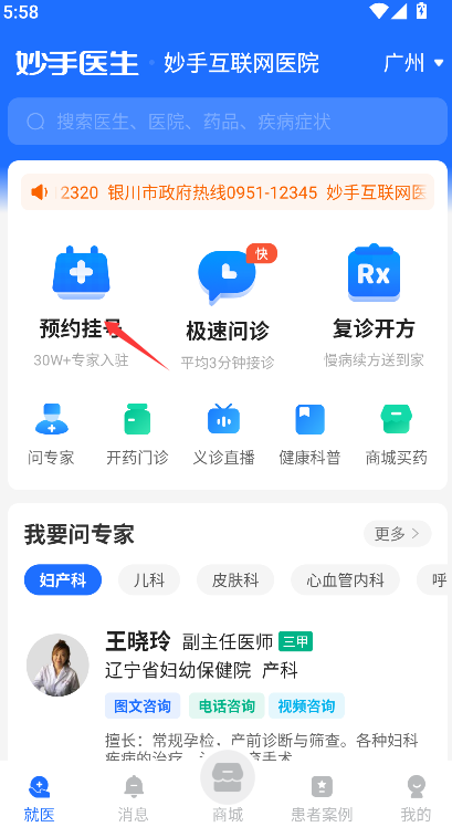 1、在主界面找到并点击“我的挂号”功能入口,页面将跳转至挂号服务主页。