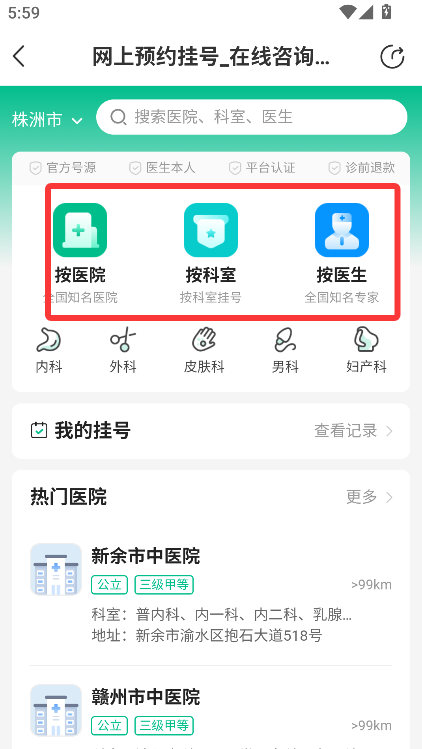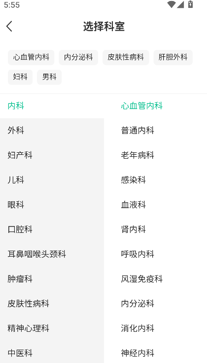 3、应用会进一步列出提供该科室服务的所有可用医院信息,选择你需要挂号的科室。