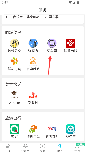 3、通过上下滚动还能发现更多服务,例如购买车票、预订酒店等出行相关功能。