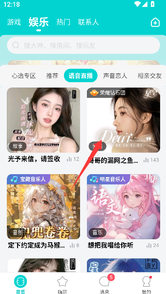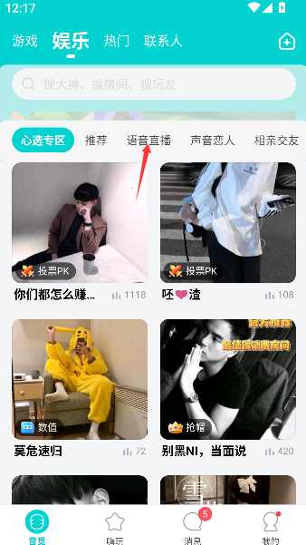 1、在软件首页界面中,可以轻松找到并点击显眼的“语音直播”入口,一键即可进入直播广场。