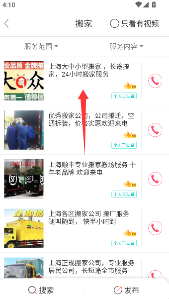 3、最后在琳琅满目的搬家信息中,选定一位有缘的师傅,手指轻点电话图标,就能立刻开启一段关于搬运的对话。