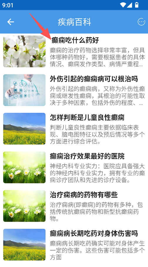 1、疾病百科功能,可查询癫痫用药、治疗效果等疾病知识,助力患者了解病情。