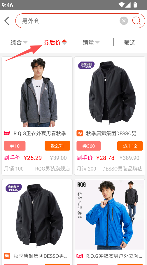 2、以券后价排序商品,价格优惠方式直观,让用户清晰感知购物省钱空间,提升购物决策效率。