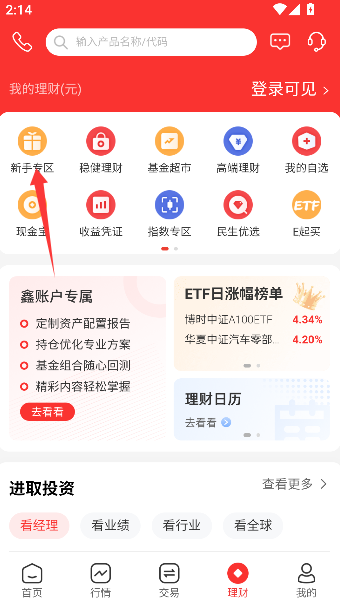 2、在理财页面中部或顶部,选择标识清晰的“新手专区”板块,这里汇集了低门槛入门产品。