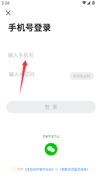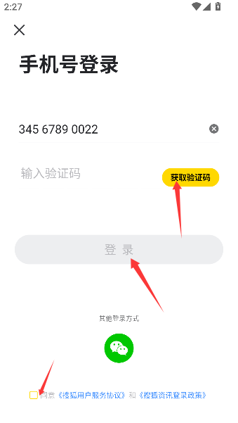 3、仔细阅读协议条款后勾选同意框,点击获取验证码按钮,输入收到的短信验证码完成登录。