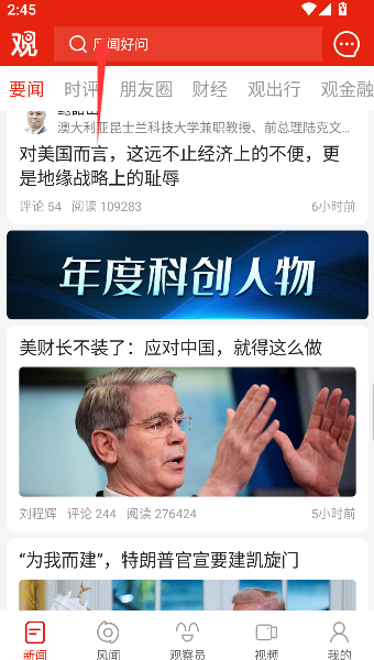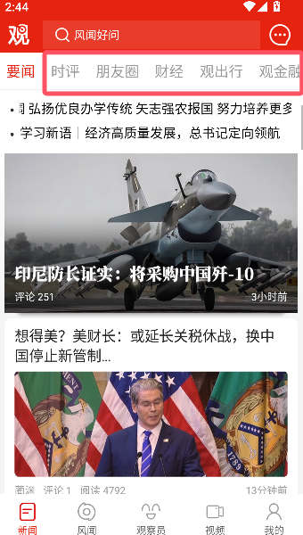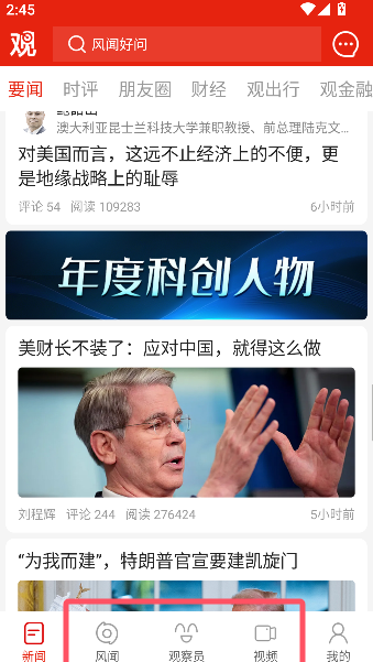 3、页面底部分布着“风闻”、“观察员”、“视频”等主要功能标签,点击可切换至相应社区或多媒体内容界面。