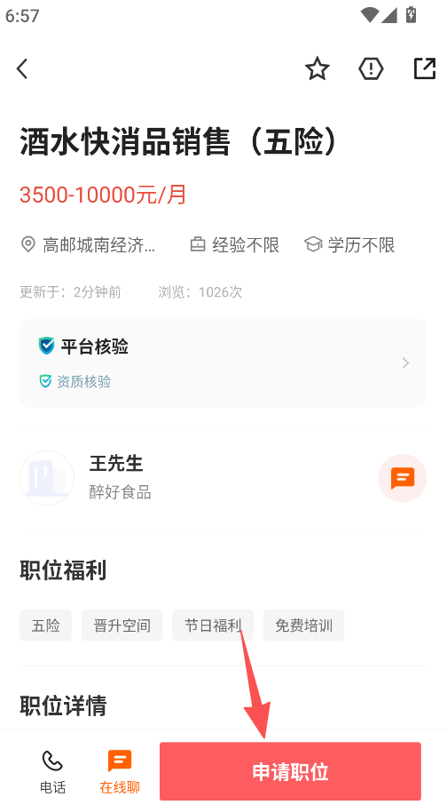 3、查看岗位详情,确认信息后点击申请职位按钮。