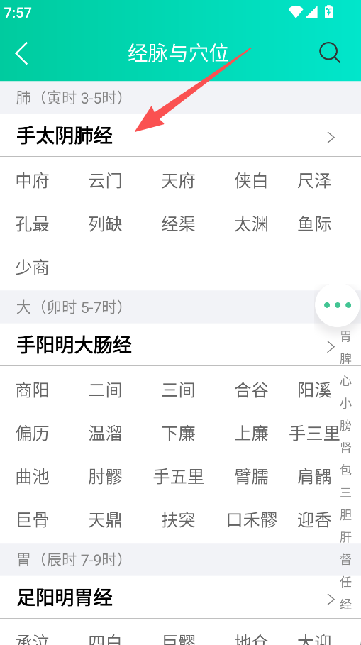 2、在经络列表中,选择目标经络如手太阴肺经。