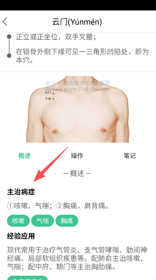 3、点击具体穴位如云门穴,即可查看其定位方法、主治病症等详细内容。