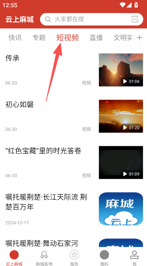 1、点击短视频,可浏览传承、初心如磐等本地特色视频。