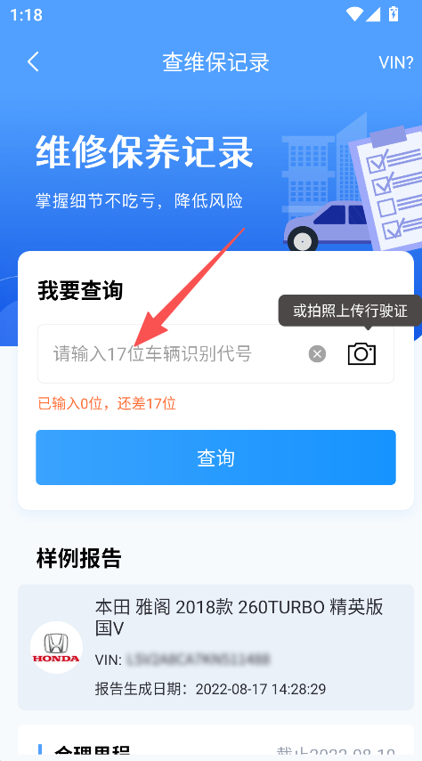 2、在查询页面输入17位车辆识别代号或拍照上传行驶证,点击查询。