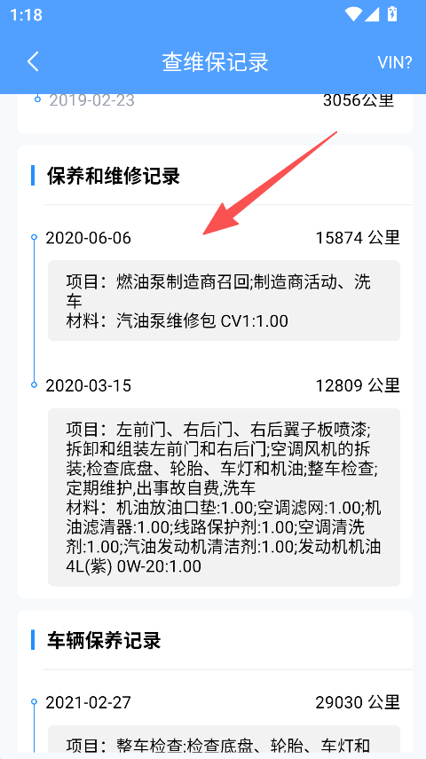 1、可查维保记录,展示车辆每次保养维修的时间、里程、项目及材料等详细信息。