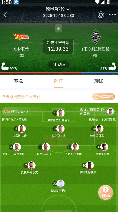 2、点击感兴趣的赛事项目,可进入赛事详情页面,查看比赛数据、球队阵容及历史对战记录。
