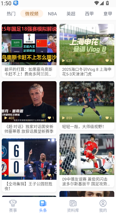 3、在头条板块中,可观看精选微视频内容,了解赛事精彩瞬间与体育相关短片资讯。