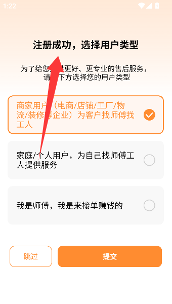 3、完成账号验证后,根据自身角色在平台提供的选项中选择对应的服务身份类型完成注册。