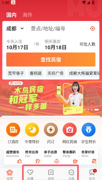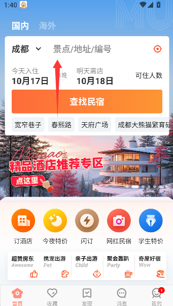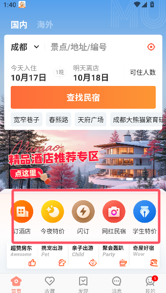 1、软件首页清晰展示订酒店、今夜特价、网红民宿等核心服务入口,方便快速选择所需住宿类型。