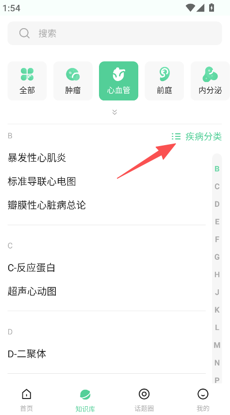 2、在心血管页面点击疾病分类,选择目标知识。