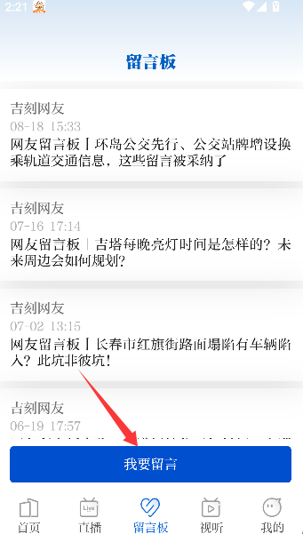 2、进入留言板页面后,点击屏幕中央或右下角醒目的“我要留言”圆形按钮进行下一步。