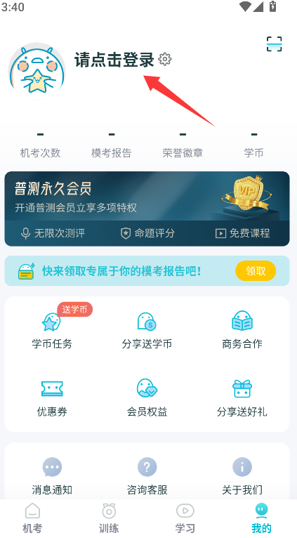 2、显示“请点击登录哦”的提示文字或按钮,点击该处即可跳转至账户登录与注册的专用界面。
