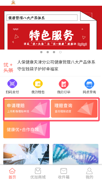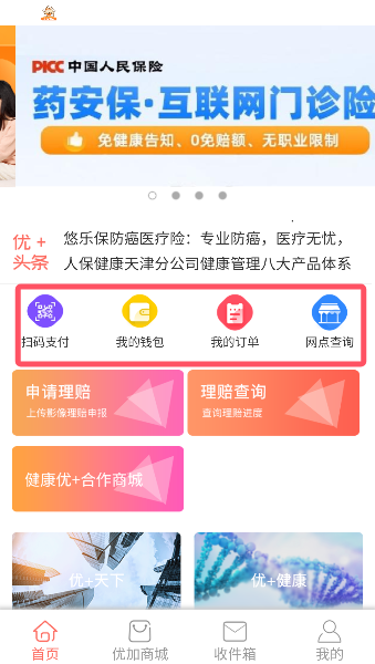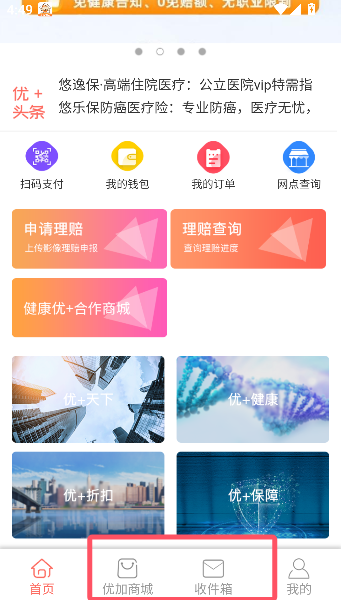 3、页面底部设有优加商城购物入口与收件箱消息中心,便于快速访问相关服务模块。