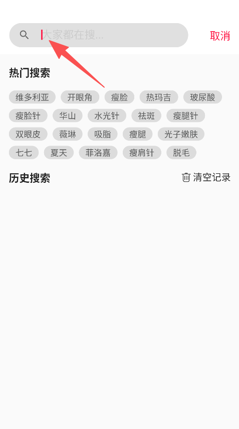 2、搜索功能,支持关键词输入,结合热门搜索推荐,快速找到目标医美项目。