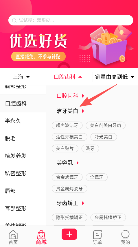 1、点击商城,选择医美项目分类如口腔齿科下的洁牙美白。