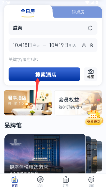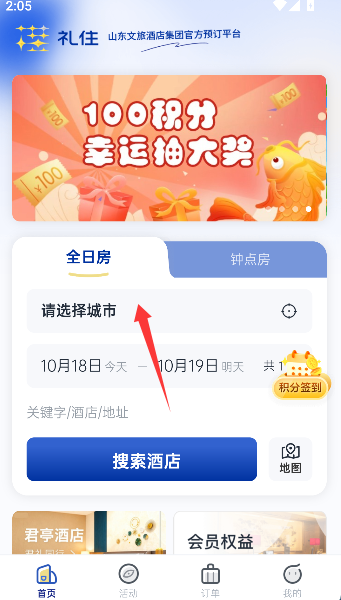 1、打开软件后首先选择当前所在城市,系统将自动定位并筛选该地区的合作酒店列表,便于快速查找合适住宿。