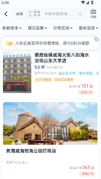 2、进入搜索酒店界面后,输入日期或关键词即可检索多家可选酒店,并直观查看价格、位置与基础服务信息。