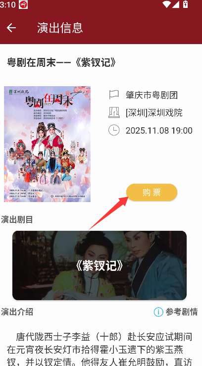 3、定位并点击“演出信息”或直接点击“购票”按钮,系统将跳转至购票页面。