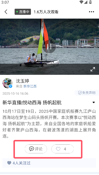 3、在直播播放页面,可点击关注按钮收藏该直播,或点击评论图标输入文字参与实时互动讨论。