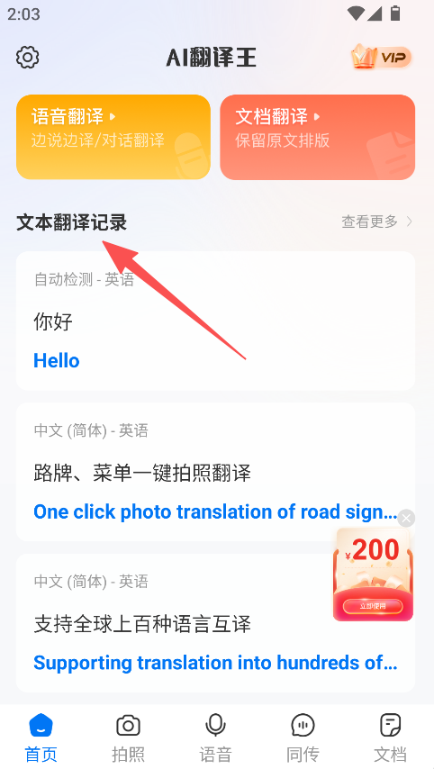 3、返回首页,点击文本翻译记录查看历史翻译。