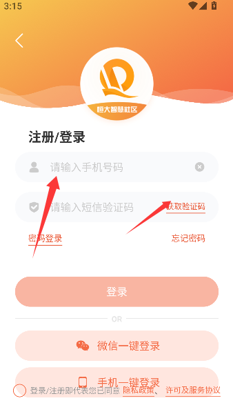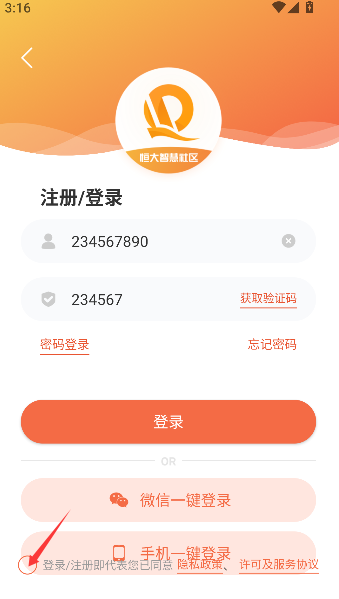 3、仔细阅读并勾选同意下方的隐私政策协议复选框,最后点击登录按钮即可进入账户并完成物业费用的缴纳。