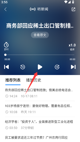 2、选择某条新闻后,点击界面中央或底部的圆形播放键,即可开始收听该条新闻的语音播报内容。