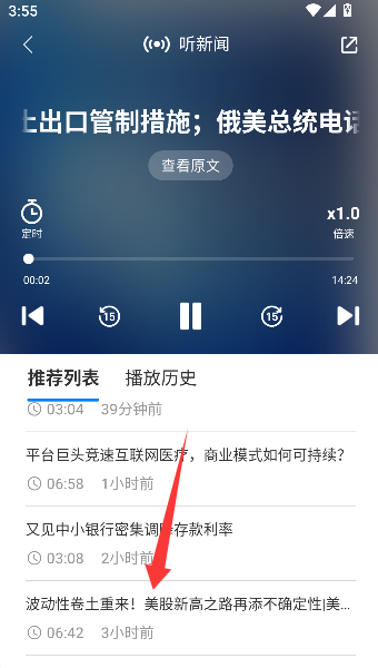 3、在听新闻界面中,可通过上下滑动屏幕浏览新闻列表,自由选择其他感兴趣的新闻标题进行收听。