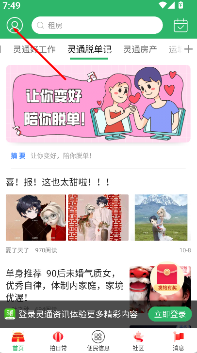 1、打开《灵通资讯》应用后,点击左上角的头像图标进入个人中心页面,可查看个人资料与相关设置入口。