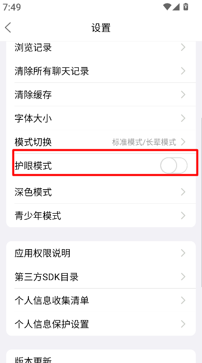 3、在设置页面中,找到“护眼模式”选项,将其开启后即可启用柔和阅读界面,减轻长时间阅读带来的视觉疲劳。