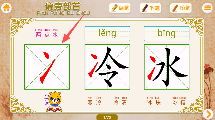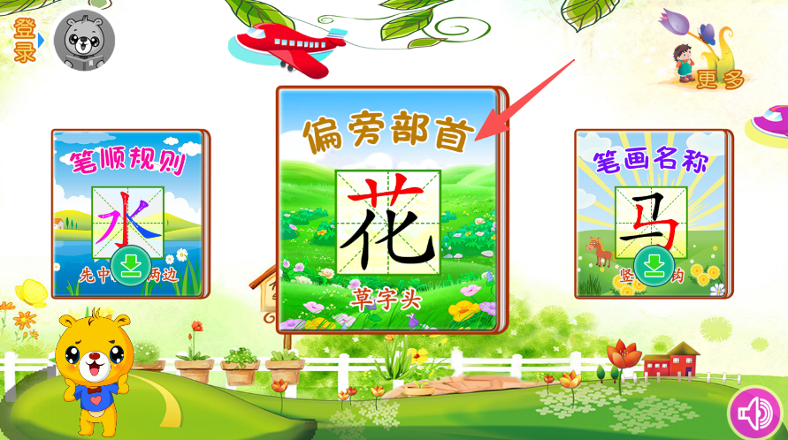 1、具备偏旁部首学习功能,展示各类部首及例字,讲解部首名称与用法,帮助儿童认知汉字构成。