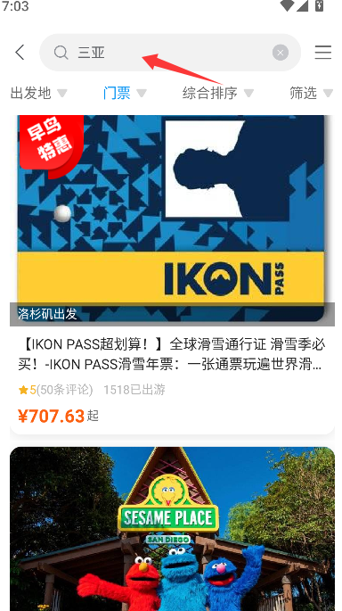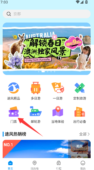 2、在顶部的搜索框中输入计划前往的旅游目的地名称,以查询相关门票产品。