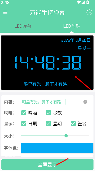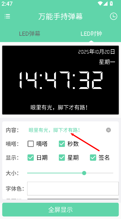3、完成设置后,点击“全屏显示”按钮,屏幕将进入全屏模式,弹幕文字会即时展示在屏幕上,方便在活动、应援或互动场合中使用。