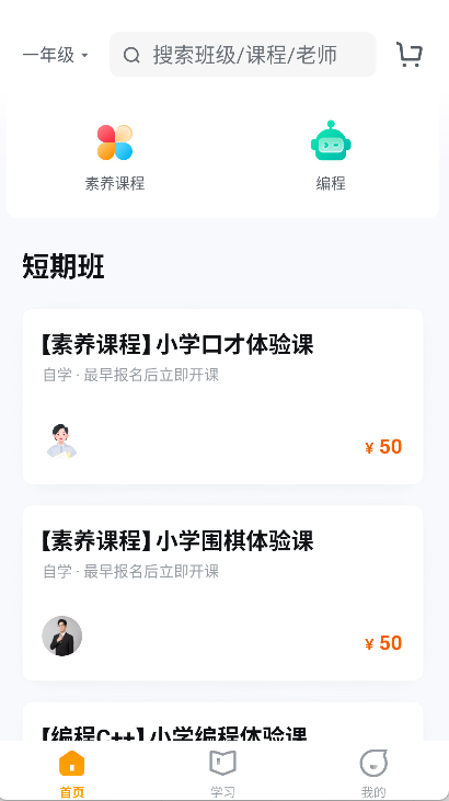 1、打开已下载的学而思STEAM应用,进入短期班课程板块,可浏览不同学科与主题的学习内容,选择感兴趣的课程进行查看。