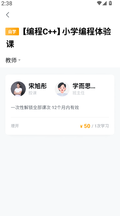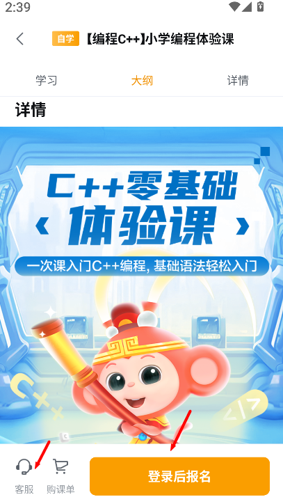 2、在课程列表中点击编程C++课程,进入详细课程页面,可了解课程目标、教学安排与适合学习的阶段。