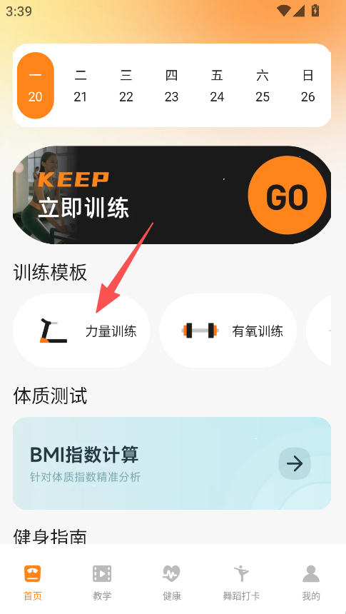2、进入首页,选择力量训练或有氧训练模板,按动作次数完成训练。