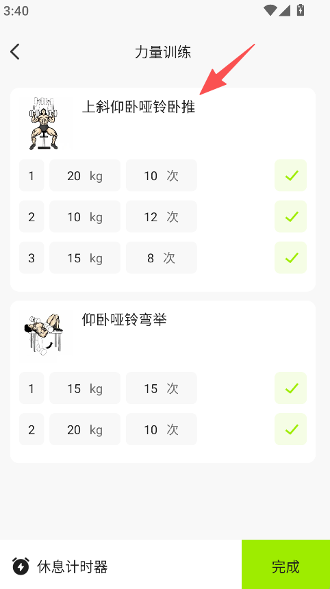2、具备力量训练和有氧训练功能,有具体动作、重量、次数的训练模板,助力健身锻炼。