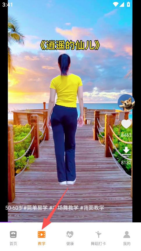 1、点击教学板块,选择舞蹈视频,跟随背面教学学习舞蹈。