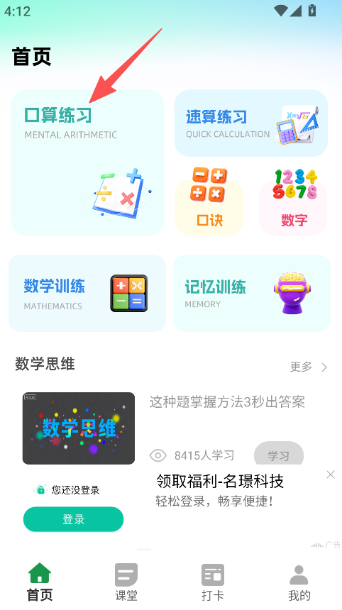 1、进入首页,点击口算练习。